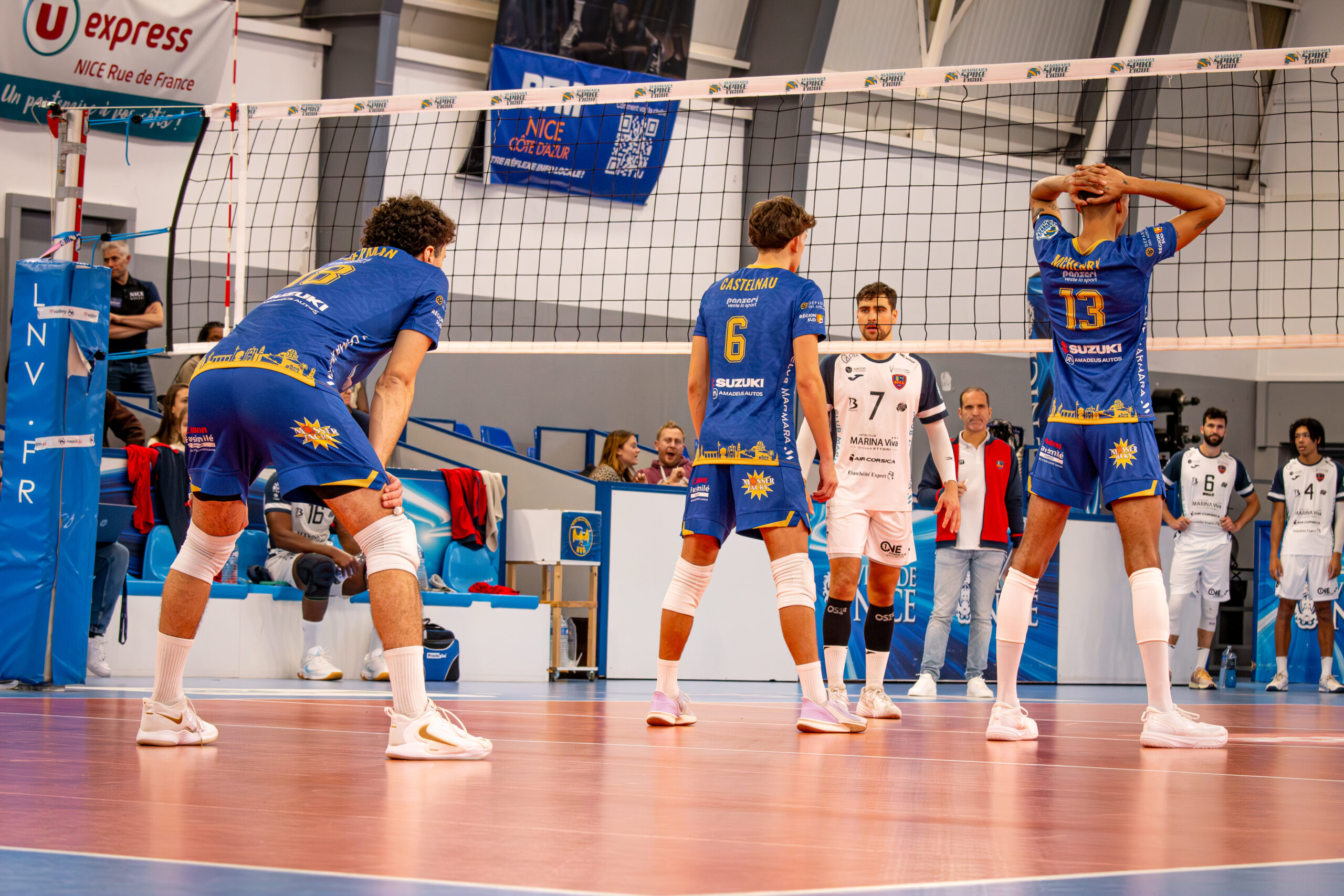 Le coach du Gazélec Ajaccio, Frédéric Ferrandez, est obligé de casser la dynamique à deux reprises avec des temps morts. Une stratégie qui peine à faire son effet. Les Corses sont en grande difficulté et subissent les affronts niçois. Le Nice Volley Ball remporte logiquement le premier set de la rencontre 25 à 16, sur sa deuxième balle de set.